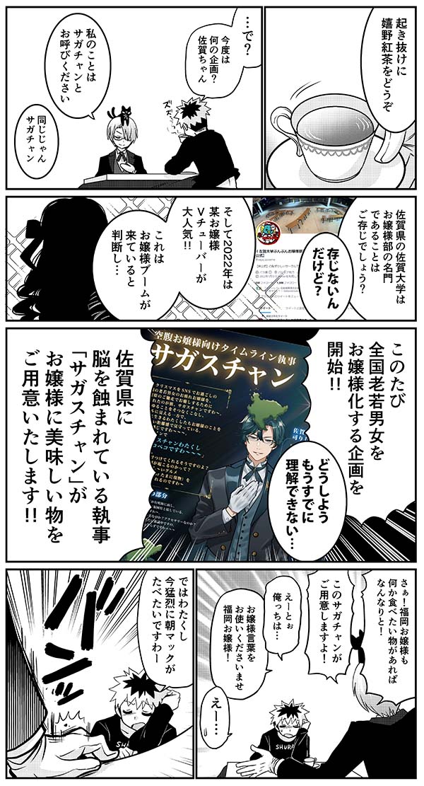 佐賀ちゃんの執事 2022年12月14日 17:30 今年もまた佐賀県が頭のおかしいPR企画やってたのでツイッターにアップしたいつもの擬人化佐賀君と福岡君まんが。わたしのサガスチャンのデリシャス☆ライフ↓↓↓https://sagaprise.jp/sagastian/ 「都道府県擬人化」カテゴリの最新記事 タグ :#擬人化#佐賀県#都道府県 < 前の記事次の記事 >