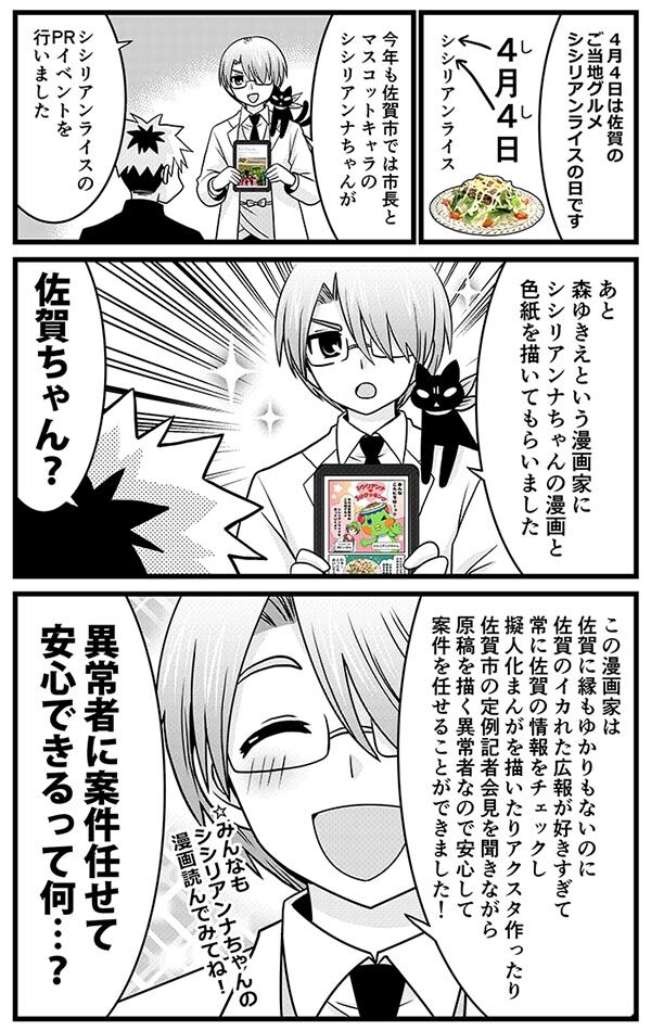 4月4日はシシリアンライスの日 2025年04月04日 15:09 4月4日は佐賀のご当地グルメ「シシリアンライスの日」ということで佐賀市から案件をいただき今回シシリアンナちゃんの漫画と色紙を描かせていただきました!シシリアンナ♡3分クッキング作るの簡単なのでぜひみなさんも家で作ってみてください。作者は佐賀に縁もゆかりもないのに前回の佐賀海苔主役祭りに続いて2度目の佐賀案件をやらせてもらってとてもうれしいのですがやっぱり佐賀の広報はイカレてるな…と思いました。これからも佐賀の観察を続けたいと思います。 「掲載情報」カテゴリの最新記事 タグ :#PR#佐賀市#シシリアンライス < 前の記事次の記事 >