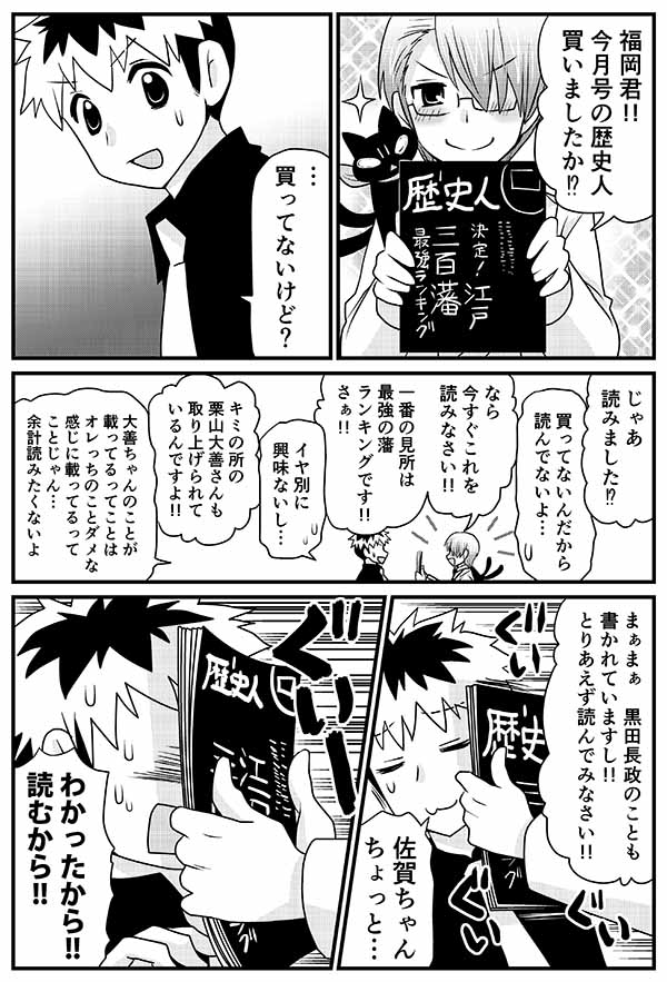 歴史人 決定!江戸三百藩 2020年11月04日 06:00 福岡君vs大善サンhttp://yukiemo.livedoor.blog/archives/1520308.html佐賀君がご機嫌になった歴史人2020年1月号はこちら。藩のデータがすごく見やすくまとめられた一冊で最高。↓ 「藩擬人化漫画 史実が遭難死シリーズ」カテゴリの最新記事 タグ :#佐賀県#福岡県#歴史#擬人化 < 前の記事次の記事 >